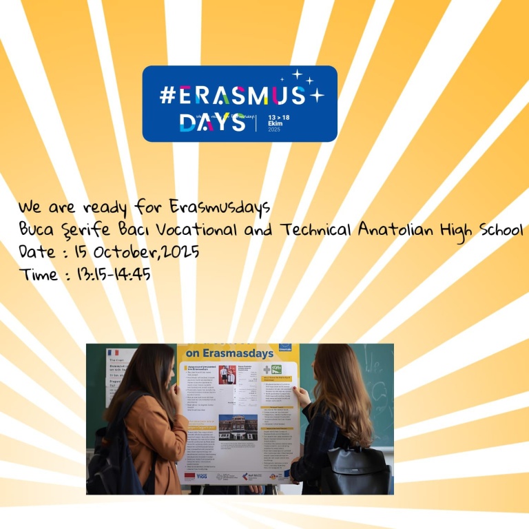 Okulumuz Şerife Bacı Mesleki ve Teknik Anadolu Lisesi'nde 13–18 Ekim tarihlerinde kutlanan ErasmusDays haftası kapsamında, öğrencilerin katılımıyla çeşitli etkinlikler yapılacak.