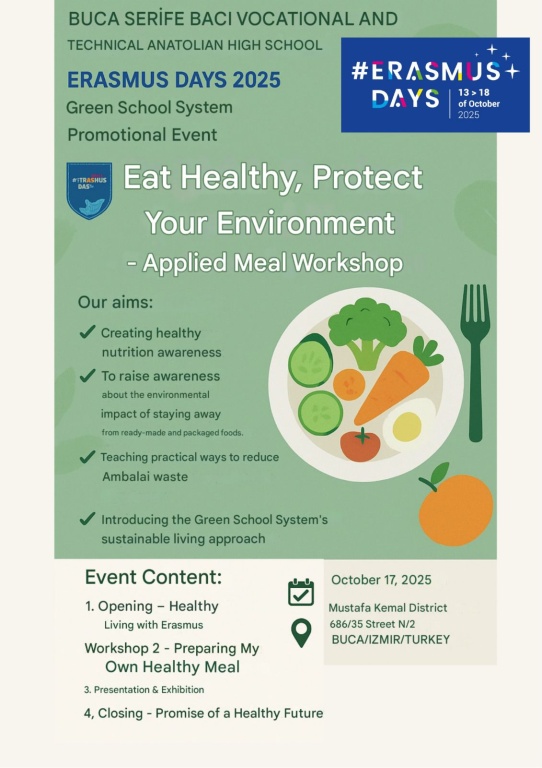 ErasmusDays etkinlikleri 17 Ekim 2025 Cuma günü 08.30–11.45 saatlerinde gerçekleştirilecek olan “Sağlıklı Beslen, Çevreni Koru” temalı uygulamalı öğün atölyesiyle devam edecek.